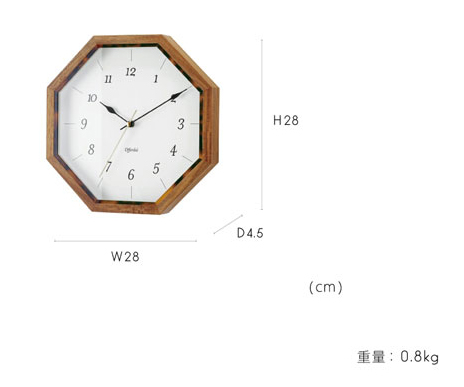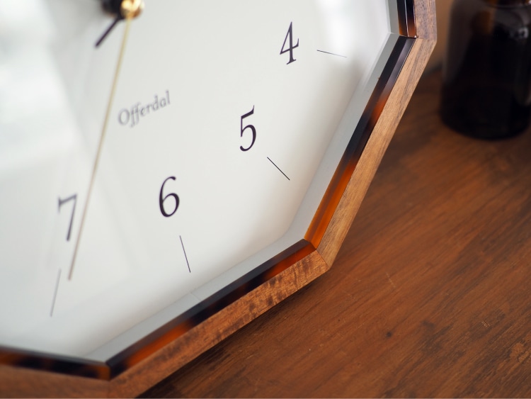 八角形のウッドフレームの内側に、さりげなくべっ甲調のアクセントを添えたウォールクロック。 ホワイトの文字盤にレトロなフォントを採用し、長くお使いいただける落ち着きのあるデザインに仕上げました。