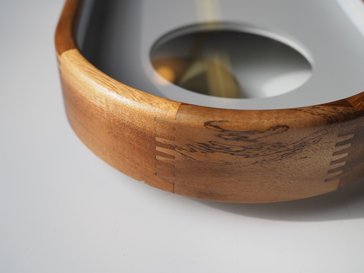 コンセプトはクラシカルでコンパクト。 一般的には大きい印象の振り子時計を飾りやすい縦長フォルムに落とし込みました。 ていねいに角を落としたウッドフレームとシンプルな文字盤デザインの組み合わせが上品な仕上がりです。 レイヤードさせたグレーの文字盤の後ろで揺れる、少し大振りなゴールドの振り子がレトロなエッセンスをプラスしています。