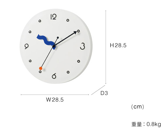 なみなみさせた短針、矢印を模った長針、点と点を結ぶ秒針。 それぞれが自由で個性があり、重なり合う姿も面白い。 「楽しい!」を表現した、ポストモダンを連想させるプレイフルデザインです。 数字はポップで丸みを帯びたフォントになるよう手書きで制作しました。 インデックスは白抜きの〇にして抜け感のバランスを意識しています。 目に飛び込んでくるビビッドなブルーのインパクトや、なかなかの速さでオレンジが移動する様もユニークでコミカルです。