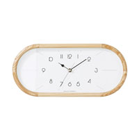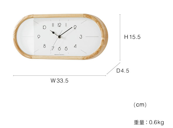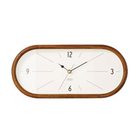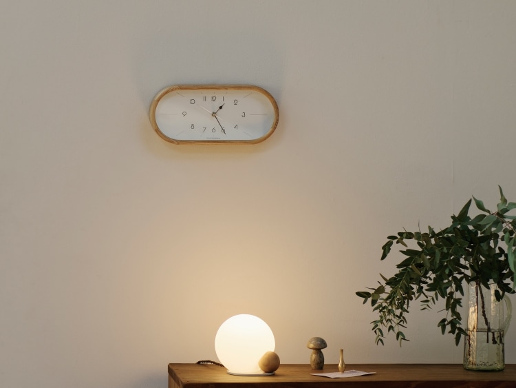 カプセルフォルムを更に横に長くした特徴的なシルエットのウォールクロックです。 ウッドフレームの前面に丸みを持たせた丁寧な仕上げと高い加工技術に高級感が感じられます。 こちらはカラーによって文字盤のデザインが異なります。 ナチュラルは数字が丸く、かわいらしさもありながらすっきりと視認性が高く、無垢なイメージ。 ブラウンはアイボリーの文字盤に長めのインデックスを合わせてミッドセンチュリーを感じさせる仕上がりです。
