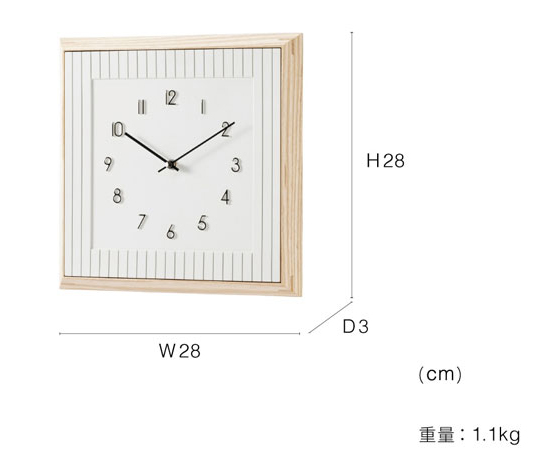 フレーム、ストライプ、中央の凹みと四角を基調としたシンプルながら深みのあるデザインの掛け時計。 スクエアを組み合わせることで立体感と陰影が生まれ、視覚的に奥行きのある印象を与えます。 柔らかくナチュラルなイメージのウッドフレームには、傾斜がついていることで単調にならず額縁のように部屋を引き立てます。 北欧テイストを感じさせるシンプルデザインで、視認性も考慮されており、どんな空間でも使いやすいです。