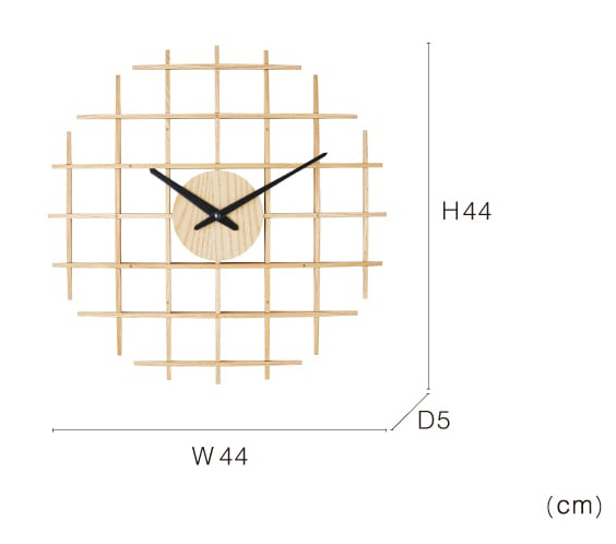 木組み建築のような立体感とインパクトのあるデザインが魅力です。 柔らかなカーブを描く木の板を格子状に組み上げ、丁寧に作られています。 数字のない文字盤は家具との馴染みもよく、大きめサイズでも圧迫感を感じさせません。