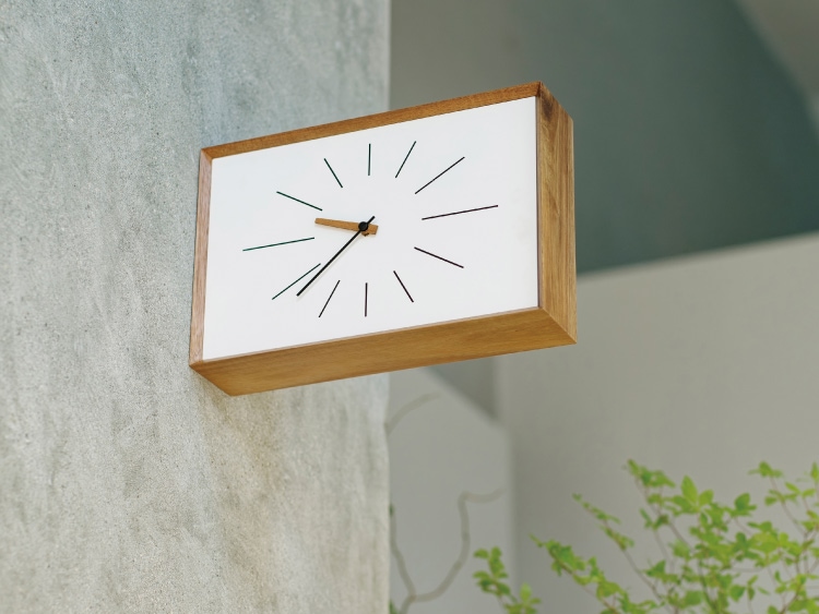 どの角度から見ても美しい比率で設計されたフォルムは、縦にも横にも、掛けても置いても。 使う人の暮らしに寄り添う、自由で新しい2way仕様の両面時計。 エッジを効かせたウッドフレームと、潔くインデックスだけを配したミニマルな文字盤が、静かに時間を知らせます。 短針にあしらった木の素材がアクセントとなり、和の空間にもなじみます。