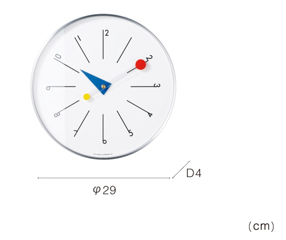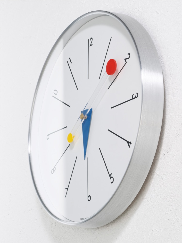 バウハウスデザインをヒントに、◯と△を取り入れたグラフィカルなウォールクロック。 シルバーのフレームがすっきりと全体を引き締め、透明な長針の先端に浮かぶ赤い◯が視覚トリックを生み出します。 ミッドセンチュリーやヴィンテージ家具にも合わせやすく、大胆ながらも洗練されたイメージに仕上げました。