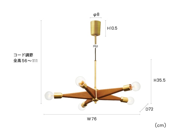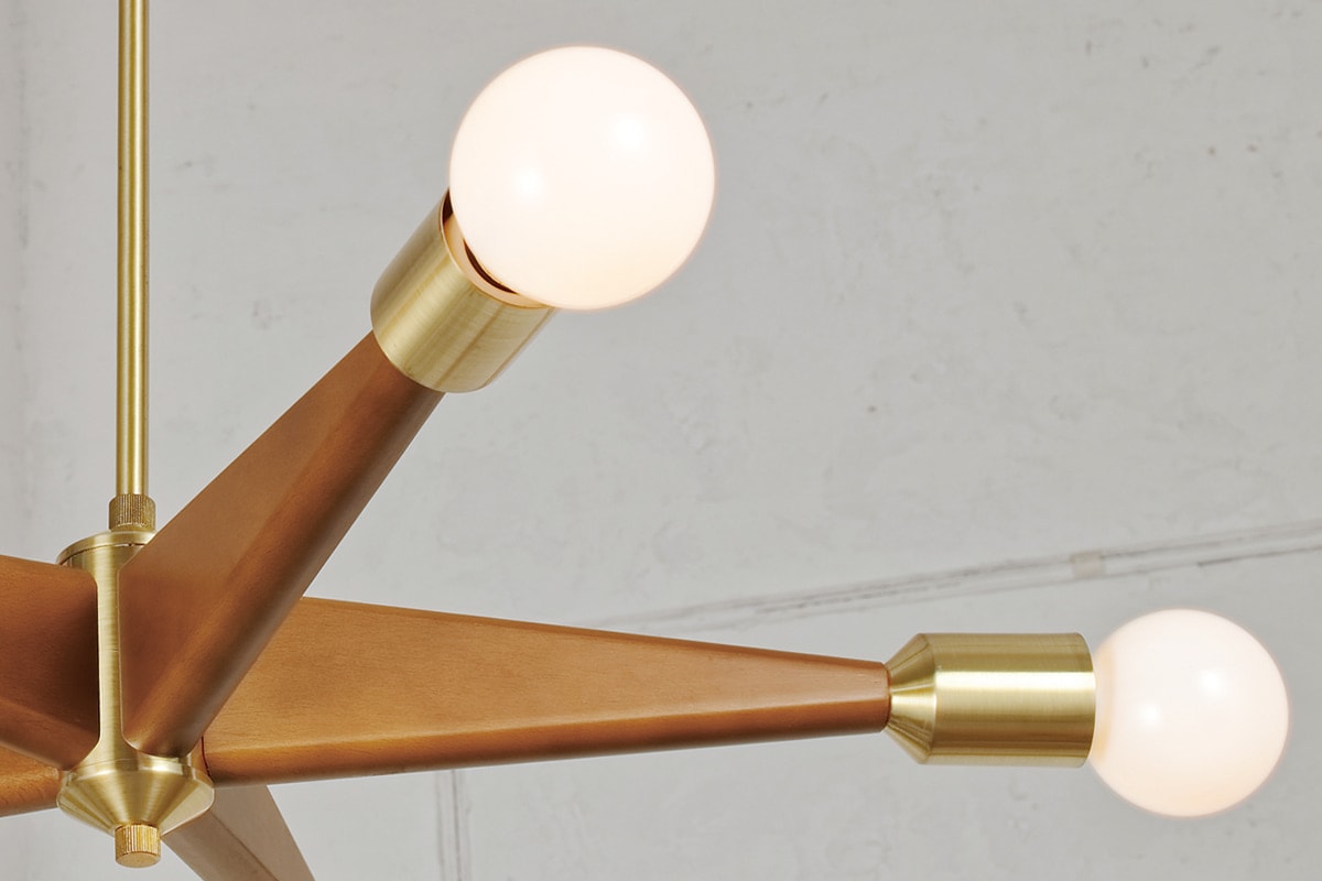 放射状に伸びた滑らかな質感のウッドアームに上品なヘアラインゴールドをあしらったペンダントライト。 インテリアの顔となる程の存在感を放つ、シックなデザインです。