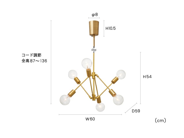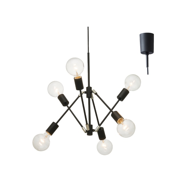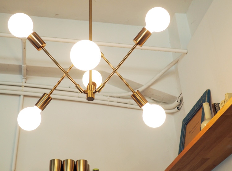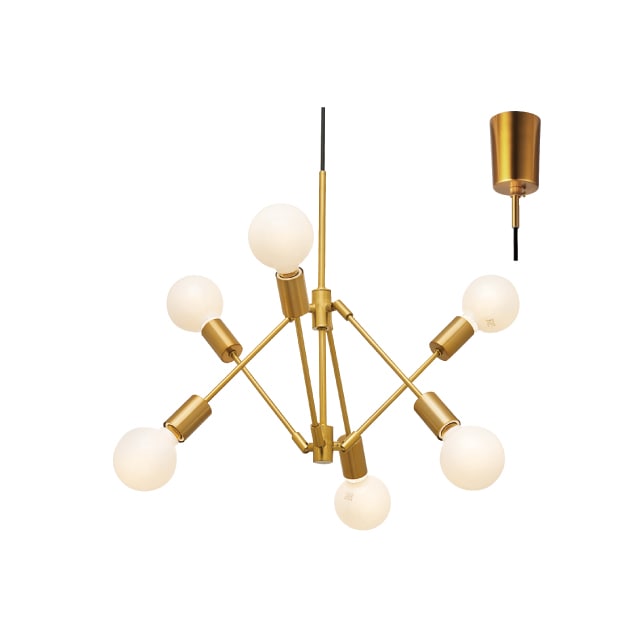 6つの電球が交差するミッドセンチュリーテイストのペンダントライト。 それぞれのアームの角度を調節してお好みのスタイリングをお楽しみいただけるユニークなデザインです。