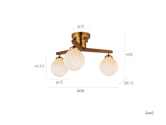 折り紙のような凹凸のある3つのガラスセードが煌めくシーリングライト。 エッジを滑らかに仕上げたウッドアームとゴールドのボディの組み合わせがレトロなムードを漂わせます。