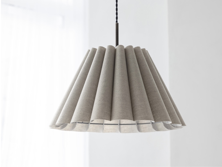 柔らかなドレープがゆったりと広がるビンテージライクなペンダントライト。 反復する膨らみと谷間が光のグラデーションを生み、立体的なフォルムと共に空間をシックに演出します。