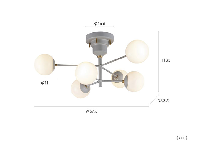 シンプルなボディに6つのホワイトガラスを配置したミニマルなデザインのシーリングライト。 細いアームやソケットとガラスを真球にすることで、より繊細なフォルムを表現しました。