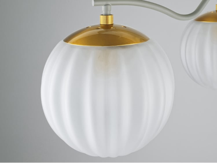 膨らみのある凹凸が連続するガラスセードが緩やかな光を届けるシーリングライト。 半透明のガラスとライトグレーの淡いトーンに合わせたゴールドパーツが品のあるアクセントに。 曲線を描くアームや丸みのあるシルエットなど、真下からでも美しく見えるようデザインされています。