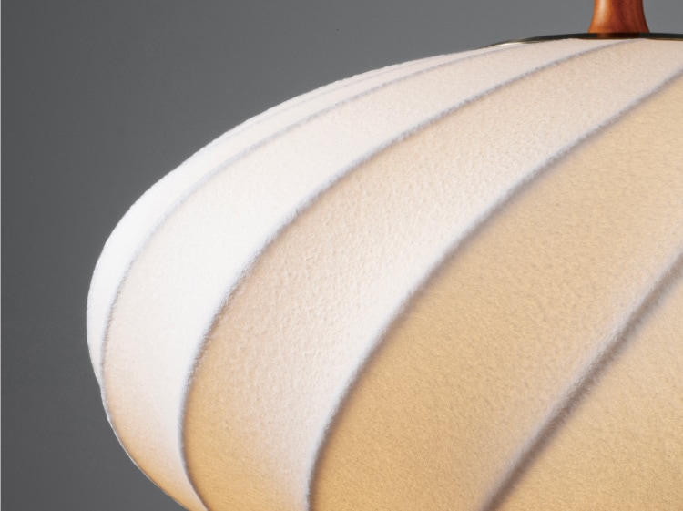 和紙にも似た弾力のある生地が人気のFalkペンダントライトの新型。 緩やかなカーブのついたオーバルシルエットに普遍的な美しさを感じます。 流れるような螺旋模様を描く細いワイヤーフレームにファイバーをスプレーで吹きつけて作られています。 セード全体が柔らかく光る様は日本の住宅にも合わせやすく、和モダンな空間づくりにもおすすめです。