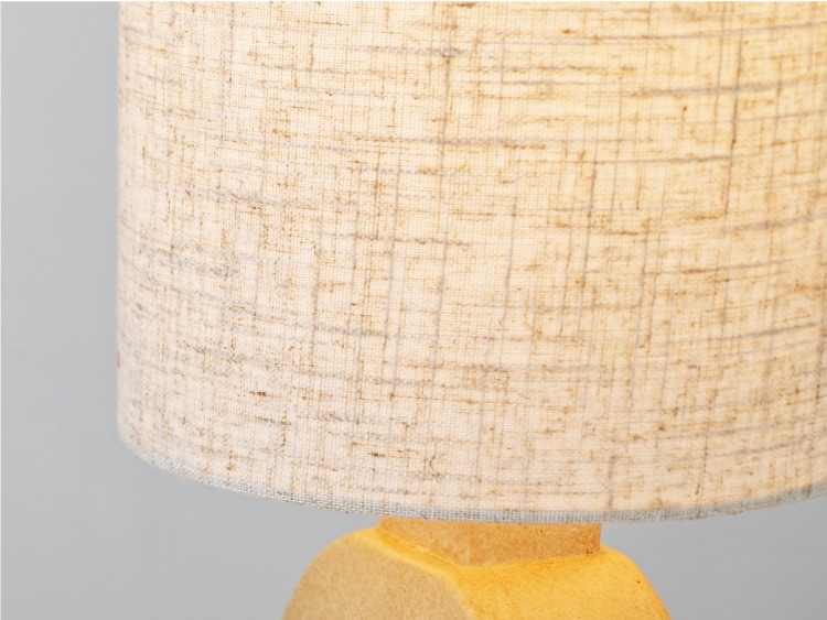 粒が混じった磁器で作られたカフェ食器のような、ほっこりとした質感に居心地の良さを感じるデザイン。 前からと横からでフォルムが異なるベースのユニークさが海外インテリアを彷彿とさせます。 ベージュトーンの淡い色合いと、麻混合の素朴なファブリックセードが柔らかな光を広げ、周囲をやさしく照らします。 べッドサイドやソファーサイドに置いて、くつろぎのひとときを演出したり、オブジェのように飾るのもおすすめです。
