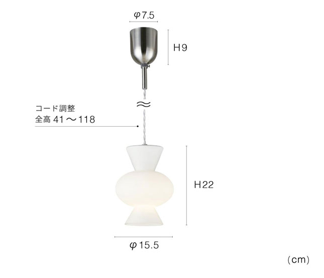 サイズ:全体:φ15.5×H22cm シーリングカバー:φ7.5×H9cm コード全高:41-118cm 重量 1.1kg |