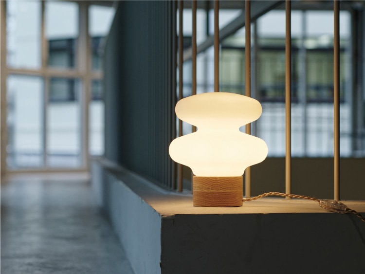 不思議なフォルムが目を引く、光るアートオブジェのようなデザインライト。 深いくびれと緩急のあるカーブが描くユニークなシルエットは、ふわりとくゆるケムリのよう。 木製ベースのナチュラルな風合いとふくよかな光が、ゆったりとした時間を包み込んでくれます。