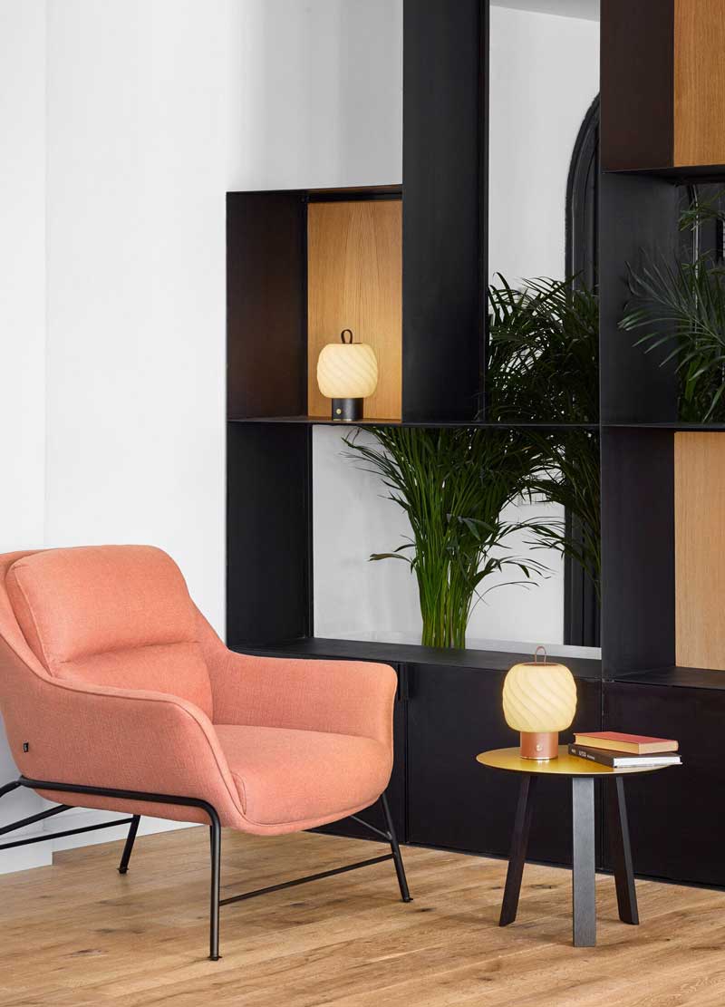 ランプ部分には半透明のホワイトマットポーセリンを使用しています。完璧な仕上がりを求めるため、ポーセリンに極めて困難な技術を用いました。ランプにはレザーのカバーと上部にフックがあり、ランプのベース部分には金メッキの金属を使用し、レザーカバーを付けています。ベース部分の前には、ゴールドにリヤドロのロゴである花が刻まれたボタンが付いており、ランプの調光ボタンになっています。ベース部分の後部には充電器に接続できるUSBポートがあります。