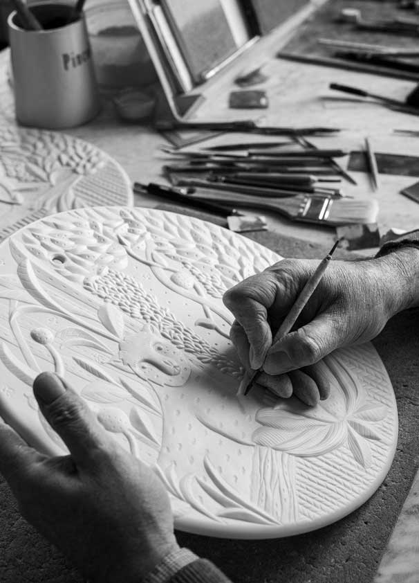 半透明のマットな白磁に施されたレリーフが精巧で、ランプが消灯していても美しいです。点灯するとレリーフが一層美しく鮮やかに映えて、生命を吹き込みます。